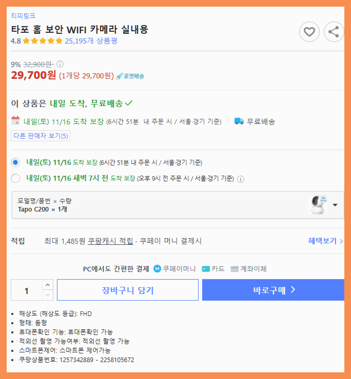 타포 홈 보안 WIFI 카메라 실내용, Tapo C200, 1개 구매하러가기 Link Click